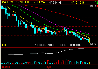 ICE原糖期貨周二(4日)收盤下跌,觸及一年以來最低位,因美元上漲,食糖供應量增加,引發市場賣盤活動。最終7月原糖期貨收盤下跌0.47美分,或3%,報14.51美分/磅,是2009年5月1日以來的最低點。
