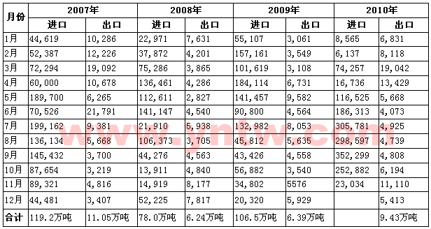 2010年全年我國食糖進口數(shù)據(jù)也將在本月20-23日公布,云南糖網(wǎng)將做及時報道。2007-2010年我國各月份食糖進出口明細表