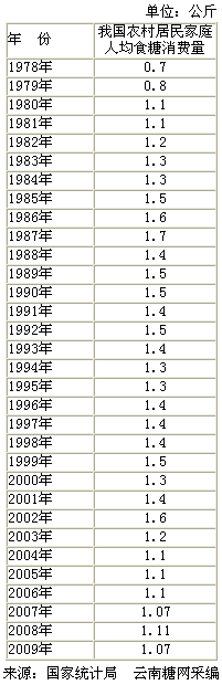 我國農村人口近8.5億,是食糖消費的最主要群體,云南糖網編輯查閱國家統計局最新數據庫,整理出1978-2009年我國農村居民家庭人均食糖消費年度統計表,數據顯示最近8年我國農村居民每年人均食糖消費量維持在1.1-1.2公斤。