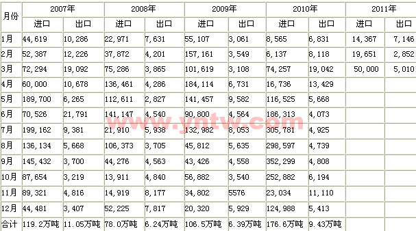 出口方面:此前海關總署公布,中國3月食糖出口量為5,010噸,較2月份出口的2,852噸增加75.7%,較2010年3月份同期出口的19,042噸下降73.7%。2011年1-3月我國食糖出口量為15,008噸,同比下降55.8%,