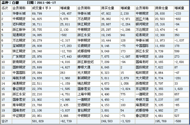 首頁(yè)市場(chǎng)行情糖類 糖類 中國(guó)糖酒網(wǎng)白糖期貨持倉(cāng)排行-鄭州商品交易所6-17 云南糖網(wǎng) 2011-06-17 16:55 糖類 品種:白糖日期:2011-06-17 名次 會(huì)員簡(jiǎn)稱 成交量(手) 增減量 會(huì)員簡(jiǎn)稱 持買(mǎi)倉(cāng)量 增減量 會(huì)員簡(jiǎn)稱 持賣(mài) 中國(guó)糖酒網(wǎng)白糖期貨持倉(cāng)排行-鄭州商品交易所6-17 上一篇中國(guó)糖酒網(wǎng)糖類價(jià)格行情-全國(guó)部分地區(qū)6-17長(zhǎng)沙¥7250-7260 鲅魚(yú)圈¥7300-7350 昆明¥6990-7000 南昌¥7300 福州¥7250 甸尾¥6950-6970 貴陽(yáng)¥7150- 上一篇中國(guó)糖酒網(wǎng)白糖期貨合約:SR107持倉(cāng)排行-鄭州商品交易所6-17中國(guó)糖酒網(wǎng)白糖期貨合約:SR107持倉(cāng)排行-鄭州商品交易所6-17 相關(guān)文章 鄭州:商品交易所白糖期貨持倉(cāng)排行8-23 情人節(jié)巧克力在日本是熱銷商品 原糖期貨放量下跌 鄭糖仍在隨商品大勢(shì)走跌 鄭糖受原糖以及大宗商品聯(lián)動(dòng)走弱影響將再度弱勢(shì)下行 本周三洲際交易所(ICE)原糖期貨漲至七周高位后小幅回落 歐債危機(jī)VS中國(guó)行情 ICE原糖期貨大幅收低 ICE10月原糖期貨收升0.46美分--8.11 洲際交易所(ICE)原糖期貨沖高回落--6.30