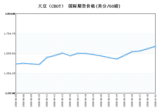 周四CBOT大豆期貨市場收高,供應擔憂繼續推動近月7月大豆期價刷新歷史高位。7月大豆收盤1658美分,上漲12.25美分,全球電子交易中更一度攀至1663美分的歷史新高,較去年同期上漲94%;8月大豆收盤1649美分,上漲9.5美分;11月大豆開盤1610美分,高點1635.5美分,低點160