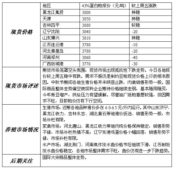 首頁(yè)市場(chǎng)行情豆類 豆類 豆粕現(xiàn)貨市場(chǎng)報(bào)道 中國(guó)食品產(chǎn)業(yè)網(wǎng) 2008-09-16 16:13 豆類 上一篇9月16日福建地區(qū)油廠豆粕報(bào)價(jià)福建地區(qū)油廠今日43%蛋白豆粕報(bào)價(jià):漳州、廈門地區(qū)油廠:3750元/噸左右;泉州地區(qū)油廠:3780元/噸,穩(wěn)定。 上一篇9月16日黑龍江哈爾濱地區(qū)大型油廠豆粕報(bào)價(jià)黑龍江哈爾濱地區(qū)大型油廠今日豆粕報(bào)價(jià):43%蛋白合同3850元/噸,較上周六漲60元/噸。 相關(guān)文章 美豆:需求強(qiáng)勁豆粕短期難跌 豆粕:開(kāi)啟季節(jié)性反彈行情 全國(guó)綠豆價(jià)格10-17 8月11日全國(guó)綠豆價(jià)格 大豆進(jìn)口量 如何再創(chuàng)新高 中儲(chǔ)糧糧庫(kù)收輪換大豆價(jià)格上調(diào) 東北豆行情“普漲” 中國(guó)糧油學(xué)會(huì)稱 各類合格油品均可放心食用 11月3日東北部分地區(qū)大豆價(jià)格行情 10月31日東北部分地區(qū)大豆價(jià)格行情 10月27日東北部分地區(qū)大豆價(jià)格行情