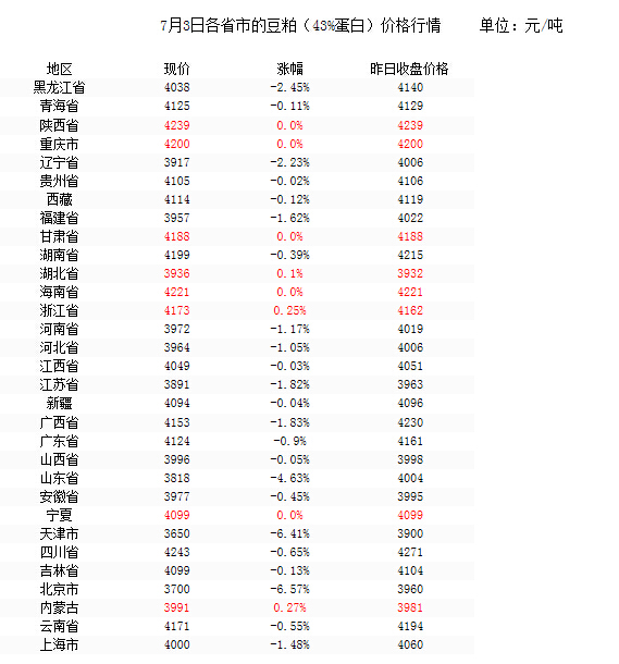 國內(nèi)產(chǎn)區(qū)大豆現(xiàn)貨市場相對穩(wěn)定。據(jù)農(nóng)博報價平臺監(jiān)測數(shù)據(jù)顯示,2014年7月3日國內(nèi)各地豆粕平均價格為4080元/噸,較昨日(7月2日)收盤價4114元/噸下跌33元/噸,跌幅為0.82%。在監(jiān)測的各省市中,最高價格為四川省4243元/噸,而天津市價格則最低為3650元/噸(以上價格均為含43%蛋白的豆粕)。