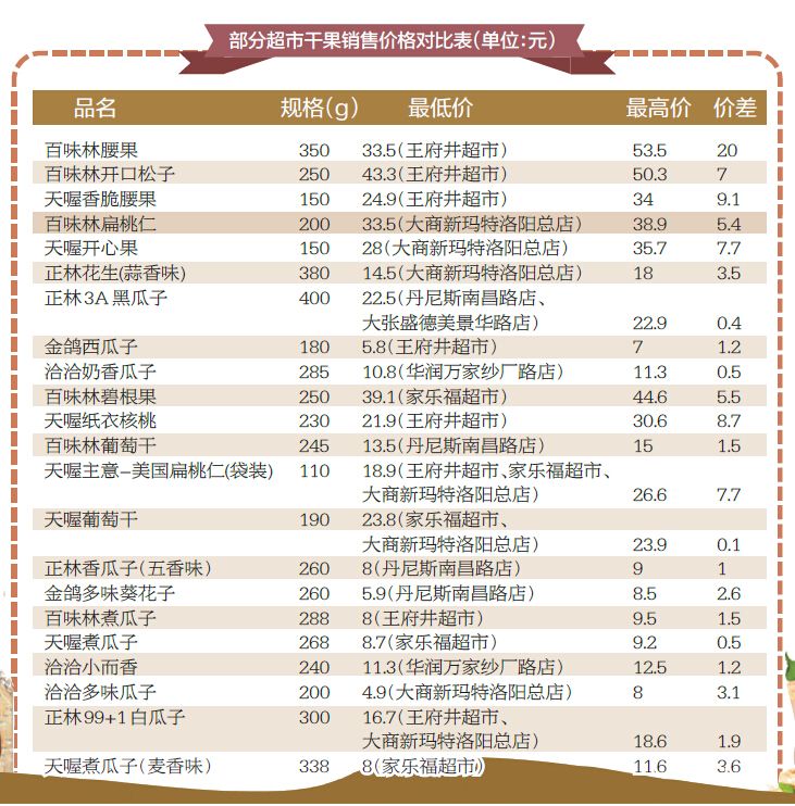 昨日,市物價(jià)辦價(jià)格監(jiān)測(cè)中心對(duì)我市部分超市的干果銷售價(jià)格進(jìn)行了采集匯總。