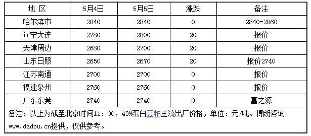 5月5日國內豆粕現貨價格基本趨穩,部分地區報價漲跌互現,波動幅度20-40元/噸。 博朗咨詢豆粕網統計:截至