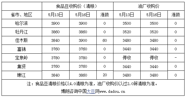 5月16日東北地區大豆現貨價格延續上周穩中上揚走勢,黑河、綏化地區優質大豆車板價上浮20_40元/噸,基層毛糧價格攀升至3800元/噸。