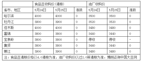 5月25日北方大豆價格趨穩運行,各地凈貨收購價格集中在3920-4000元/噸,車板價4040-4100元/噸區間,40%蛋