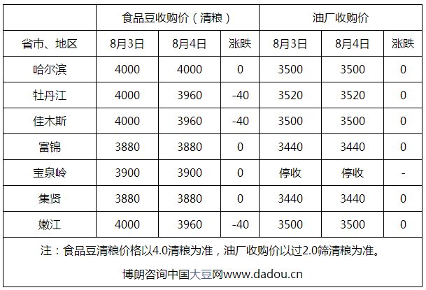 首頁市場行情豆類 豆類 8月4日東北部分地區大豆收購價格 大連商品交易所網 2016-08-04 18:24 豆類 8月4日東北地區大豆價格延續下跌走勢,黑龍江西部地區價格下跌較為明顯,訥河、克山、拜泉等地凈貨收購價 8月4日東北地區大豆價格延續下跌走勢,黑龍江西部地區價格下跌較為明顯,訥河、克山、拜泉等地凈貨收購價格降至3800-3900元/噸,車板價由上周的4200元/噸下調至4100元/噸。 省內糧商急于出售現貨,但銷區市場需求極為低迷,糧商認為2015年大豆在質量和價格上均無優勢可言,且在各個市場購銷無利可圖,所以多數買主青睞于購買價格更為低廉的陳糧。 預計短期行情穩中趨弱運行,建議謹慎入市。 上一篇8月3日黑龍江省部分地區大豆收購價格8月3日黑龍江省部分地區大豆收購價格: 哈爾濱地區國標三等 3640-3760元/噸; 綏棱地區國標三等 3560-3720 上一篇8月5日全國部分地區大豆收購價格8月5日現貨市場表現平靜,各地價格較昨日相比無明顯變化。 今日國家臨儲大豆總體成交情況略有好轉,本周總 相關文章 全國綠豆價格10-17 8月11日全國綠豆價格 中儲糧糧庫收輪換大豆價格上調 東北豆行情“普漲” 11月3日東北部分地區大豆價格行情 10月31日東北部分地區大豆價格行情 10月27日東北部分地區大豆價格行情 10月26日東北部分地區大豆價格行情 25日東北部分地區大豆收購價格行 10月24日東北部分地區大豆價格行情 10月21日東北部分地區大豆收購價格行