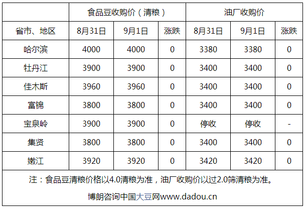 9月1日東北地區(qū)大豆價(jià)格繼續(xù)持穩(wěn)運(yùn)行,市場(chǎng)交易量較前期有增加,這限制價(jià)格下跌,但拍賣的壓力短時(shí)間難以