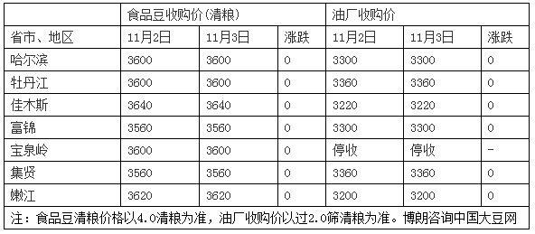 11月3日東北產地大豆收購與外銷價格沒有明顯調整,凈糧收購價格集中在3500-3600元/噸,車板價3700-3800元/