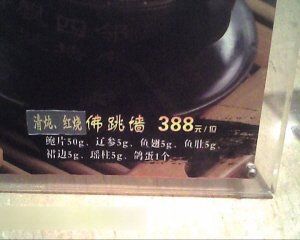 為了核實情況,經視記者來到一家攤主提到的酒家。在粵菜的點菜區,記者看到有一種菜品叫“一品滿盤香”,558元每份,里面有鮑魚、裙邊、瑤柱等食材。還有一種菜品叫“佛跳墻”,388元每份,里面有鮑魚、魚翅、裙邊等食材。