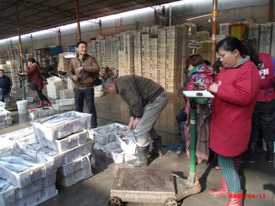 2、從冷凍水產(chǎn)品交易來看:進(jìn)入四月份,凍品交易的特點(diǎn)是:由于熱氣小黃魚較多,價(jià)格比較低,一定程度上影響了凍品的銷售。但同時(shí),凍品市場上由于帶魚產(chǎn)量少,凍品帶魚基本沒有貨,不管是國內(nèi),還是國外,因此帶魚比較緊俏。據(jù)老板介紹,總體價(jià)格還是比較平穩(wěn)的。從價(jià)格方面來說,規(guī)格為60-80克的小黃魚賣到60元/箱(7斤裝),規(guī)格為80-100克的小黃魚賣到80元/箱(7斤裝),規(guī)格為100-150克的小黃魚賣到130元/箱(7斤裝)。規(guī)格為300-400克的魷魚賣到80元/箱(7斤裝),規(guī)格為400-500克的魷魚賣到100元/箱(7斤裝)。規(guī)格為200-300克的力魚賣到180元/箱(40斤裝),規(guī)格為300-400克的力魚賣到600元/箱(40斤裝),規(guī)格為400-500克的力魚賣到850元/箱(40斤裝)。規(guī)格為200-300克的墨魚賣到200元/箱(20斤裝),規(guī)格為300-400克的墨魚賣到200元/箱(20斤裝)。