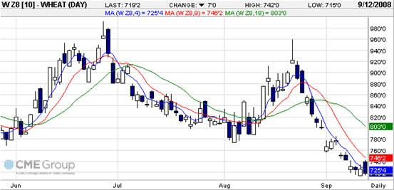 9月12日收盤時,12月小麥合約比一周前跌了32.25美分,報收719.25美分/蒲式耳;3月合約跌了33美分,報收741.75美分/蒲式耳。