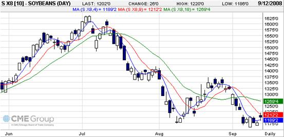 9月12日收盤時,11月大豆合約比一周前漲了25美分,報收1202美分/蒲式耳;1月合約漲了24.25美分,報收1218美分/蒲式耳;3月合約漲了25.75美分,報收1232.50美分/蒲式耳。