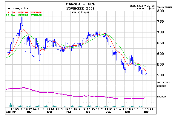 9月12日收盤時(shí),11月油菜籽合約比一周前跌了0.50加元,報(bào)收508.10加元/噸;1月合約上漲0.30加元,報(bào)收519.60加元/噸;3月合約漲了0.70加元,報(bào)收529.50加元/噸。