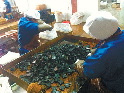 鹵制間的門口是一個大大的鹵水池,錢勇軍從中舀出一瓢制作鹵水的原材料,記者發現里面的原料分別是香菇、冬筍、豆豉、干蘿卜皮。“其中冬筍發酵時間很長,3年后才能發酵,它也是導致鹵水成黑色的原料。”