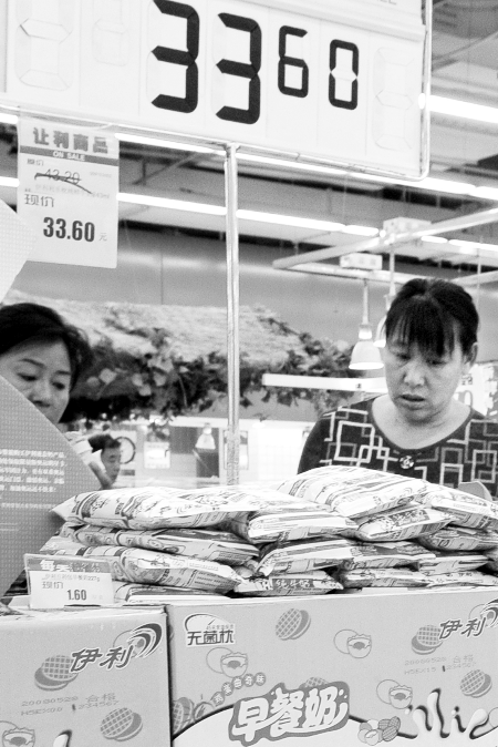 在該超市成堆的牛奶銷售區,帶有“特價”字樣的價格標簽一字排開,涉及蒙牛、伊利、光明、三鹿花花牛等多個品牌。其中,單袋為250克的蒙牛純牛奶,每箱(18袋)售價由38.4元降到36.8元,而相同規格的伊利純牛奶,每箱售價由36.8元降到33.6元。