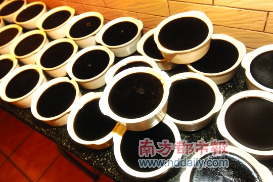 位于海珠區洪德路56號的另一家有80多年歷史的老字號“耕田公”也被腳手架嚴嚴實實地遮起來。店主葉桂妹正在忙著把煎煮好的“老耕田公涼茶”裝進鐵壺,旁邊桌子上,是一排剛做好的龜苓膏。“下雨天,顧客很少。天熱的時候,這里可是供不應求”,葉桂妹說。