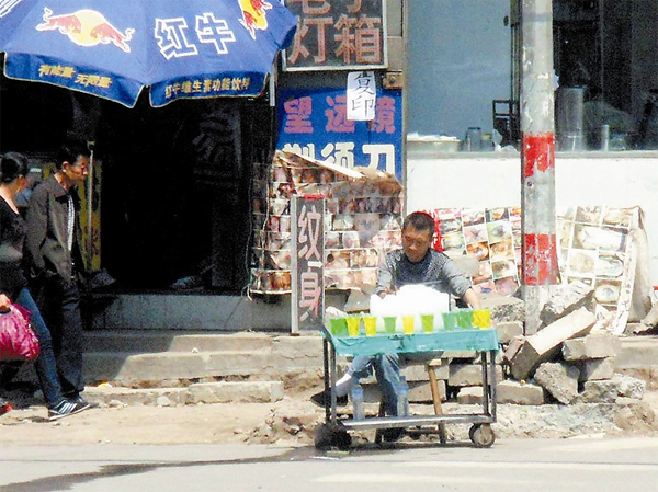 李先生說:"剛才我去火車站買票,路過站前廣場南面的早早便利店門口時,看到有人在賣飲料。商販口里不停地喊著:'冰水,一元,加冰一元'。由于天很熱,而且聽到飲料價格又便宜,我便要了一杯。當(dāng)我正要端起飲料一飲而盡時,這個商販問我要不要加冰。我想加冰一元也不貴,還解渴,就加了一些。喝完后我便掏出2元錢交給對方,沒想到這個商販卻撇了撇嘴說:'加冰1元,飲料9元',這不是欺詐嗎?跟他爭辯時,小攤旁冒出兩個30多歲的男子,惡狠狠地盯著我看,攤主也不停地用菜刀砍鑿著面前擺放的冰塊。我一看這陣勢,心想別因為10元錢掛了彩,最終自認(rèn)倒霉。"聽了李先生的經(jīng)歷后,記者便前往火車站進行暗訪。