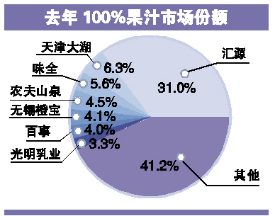 今夏業內增加了對果汁的投資,百事可樂在全國最少8個城市推出“純果樂100%”果汁,和定位中高端的都樂牌一起推行雙品牌策略。可口可樂發布有10多種營養元素的果汁飲料“美汁源10分V”,光明也在廣州上市了冷藏果汁,匯源在浙江建立首個基地。