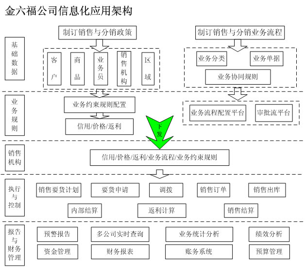以數(shù)據(jù)集中管理的系統(tǒng)架構(gòu)為基礎(chǔ),滿足金六福公司通過信息系統(tǒng)配置業(yè)務(wù)政策、業(yè)務(wù)控制規(guī)則的要求,構(gòu)建企業(yè)經(jīng)營管理平臺,并以平臺規(guī)范、控制金六福公司營銷網(wǎng)絡(luò)的經(jīng)營運作。