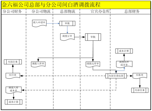 業(yè)務(wù)協(xié)同以下面的產(chǎn)品調(diào)撥為例來說明:金六福公司總部與分公司間酒類產(chǎn)品調(diào)撥流程