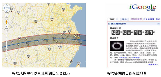 這一次日全食發生時間在9點35分,正值上班高峰時段,普通上班族或者無法親臨觀測點,或者無法上網觀看,而谷歌個性化首頁日食小工具(g.cn/ig)提供了日食專題的點播回看與精彩資訊。谷歌、東方衛視、東方寬頻三方聯手,通過谷歌個性化首頁(g.cn/ig)以及谷歌地圖(ditu.google.cn)的網絡傳播平臺,把多點連線現場直播的原生態畫面完整呈現給全國億萬用戶,為不能親臨觀測點的網友提供觀看日食的新途徑。有超過600萬用戶選擇添加了這個小工具到自己的谷歌個性化首頁,185萬人通過這一工具觀看網上視頻直播。