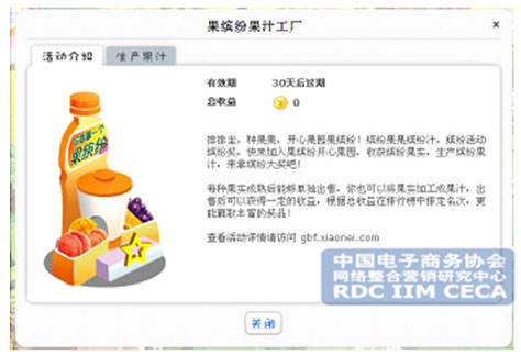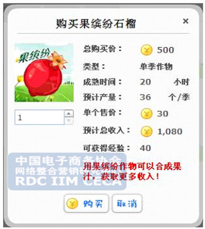 在校內及千橡開心網兩大平臺的人氣游戲“開心農場”中,用戶可以在游戲中用虛擬貨幣購買果實種子包進行種植,每種果實成熟后能夠出售,也可以為果汁加工提供原料;