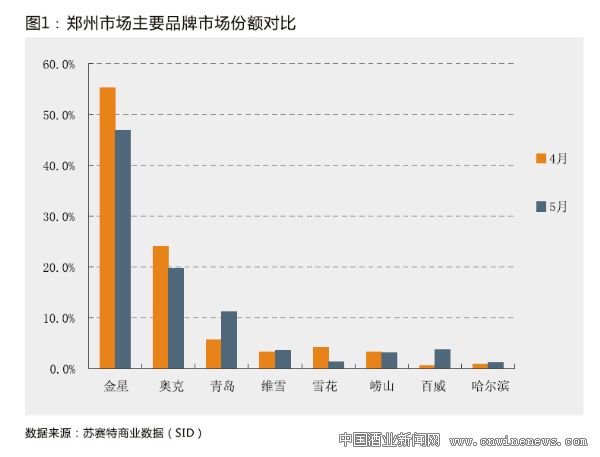 以前,河南鄭州市場向來只有金星啤酒與奧克啤酒的對決,如今,隨著各大啤酒巨頭的滲透,“雙英對決”正在演變成“四強混戰”。金星啤酒的市場份額降幅最大,5月份降到50%以下,四大渠道都有不同程度的下降,尤其以傳統渠道下滑幅度最大;而奧克啤酒也遭遇了同樣的困境,市場份額下滑到20%左右,傳統渠道和現代渠道齊齊下滑,雖然餐飲渠道能維持小幅上升,但高檔餐廳的市場份額卻在大幅下降。華潤雪花啤酒也有明顯的下滑,雪花啤酒和奧克啤酒的一同下滑反映出因收購帶來的市場不穩定因素,整合和對接的快慢進程決定了市場的下滑程度。