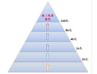過去在市場形勢很好的情況下,廠家產品線都往上走,二線白酒重點打造500-800的次高端產品,三線白酒也重點打造100-200價位的相對的“高端”產品。但在目前市場形勢相對轉冷的情形下,二線白酒對100-200價位的份額之爭是必然。此外,在消費升級下,一部分原本消費三線白酒的商務消費和居民個人消費會向二線白酒消費轉移。中國人的愛面子文化,不同檔次的消費是依據消費能力而決定的。當隨著居民收入提高,品質意識增強,有能力消費更高檔次的白酒時就有可能會選擇品質更好品牌力更強的中高端白酒品牌。