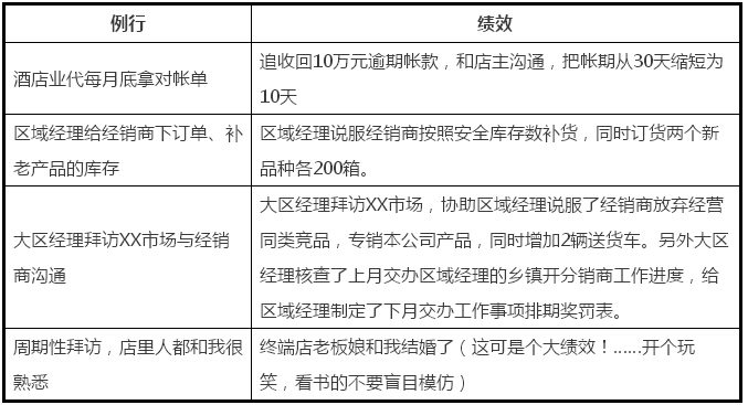 我們到底希望員工做例行,還是做績效?當然希望他們做績效。所以每個終端業代晚上回來主管要跟他面談今天的“績效”。員工開早會要匯報“績效”。員工拜訪每一個終端出門前要反思“績效”。