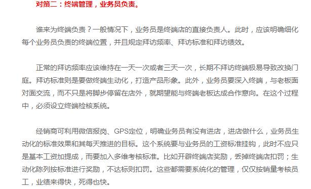 因為業(yè)務員疏于終端拜訪,本品自不可避免地被競品壓制或覆蓋。在你看不見的時候,競品的業(yè)務員已經(jīng)破壞了本片的陳列、海報、店招、POP等終端形象,遏制了產(chǎn)品動銷。失去了這些生動化的陳列,再想要動銷就難上加難。拜訪客戶、維護客情,除了身臨終端之外,利用新媒體工具聯(lián)絡感情、維護客情也很必要。這三個因素的全部落地并不輕松,如果都能達到80%以上,動銷問題一定能解決。