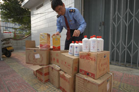 據(jù)了解,貴州茅臺酒股份有限公司曾向國家工商總局反映稱,市場上有人模仿該公司的商標(biāo)標(biāo)志、企業(yè)標(biāo)志、知名商標(biāo)特有外包裝,打著“ 專供酒”、“ 特供酒”、“ 內(nèi)供酒”、“ 接待專用酒”等旗號搞銷售,誤導(dǎo)消費者。日前,靈秀工商所執(zhí)法人員在食品安全專項整治行動中,在靈獅街菲律賓商廈2樓,發(fā)現(xiàn)一家自稱為“香港某酒業(yè)發(fā)展公司”的國內(nèi)營銷中心,竟然搞起了國酒茅臺批發(fā),銷售所謂的職工專用“內(nèi)供酒”,涉嫌侵權(quán)假冒;同時,執(zhí)法人員在文 章 來 源:cnwinenews.com檢查中,發(fā)現(xiàn)“香港某酒業(yè)發(fā)展公司”根本不存在,且該公司沒有工商營業(yè)執(zhí)照,屬于無照經(jīng)營,執(zhí)法人員隨后查扣了24瓶涉嫌假冒的“內(nèi)供酒”。