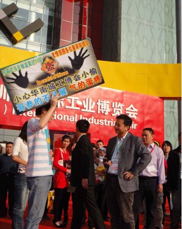 開幕式當日,某參展商隨身包以及攝影包等物件被盜,在報案后,派出所民警調查監控錄像協助破案的過程中,發現諾大的二號展館,竟然沒有監控錄像。在工博會承辦方華南城不作為、不負責任的情況下,無奈該參展商做出退出了展會,自制手舉牌,友情提醒防扒的舉動。