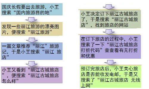 可以看到上面的流程圖,首先,要想在網(wǎng)上預(yù)訂酒店的客戶,需要對(duì)目標(biāo)關(guān)鍵詞進(jìn)行搜索,其次是通過(guò)品牌的探索,新渠道的發(fā)現(xiàn),品牌的信任度,最后才是下訂單,并有機(jī)會(huì)進(jìn)行回訪,增加信任。