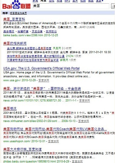 我們在百度搜索美國,可以看到這樣的一個結果。會出現有美國國家的介紹,美國最近的一些國家新聞。美國購物的網站。美國地圖。美國電影。為什么會這樣了。其實很容易解釋。大家不要忘記了搜索引擎最大的一個宗旨。就是把最好的搜索結果展現給用戶。其實百度有一個原則,就是他希望用戶對具體一個關鍵詞的需要能在搜索結果的第一頁都獲得滿足。也就可以解釋為當某一個用戶在搜索美國的時候,他不知道用戶的具體用意。所以就會出現以上的搜索結果。百度發現,在搜索結果第一頁中適當放上一些類似58同城或者趕集網的搜索結果,會更好的滿足用戶的搜索滿意度。那么這些對我們的啟發是什么?
