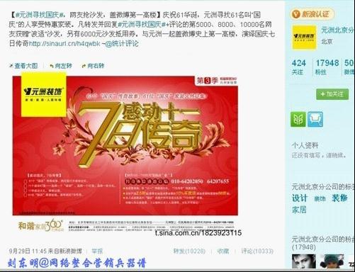 金九銀十,國慶長假一向是商家掘金的最佳時機。2010年9月28日,新浪微薄一則主題為“元洲尋找國慶、網友搶沙發、蓋微博第一高樓”的博文受到大受追捧,該博客粉絲不到一天就突破千人。原來,該博客是一家500強的裝飾公司——元洲裝飾公司。公司在國慶長假推出搶沙發活動,慶祝61華誕,元洲尋找61名叫“國慶”的人享受特惠家裝。凡轉發并回復#元洲尋找國慶#+評論的第5000、8000、10000名網友獲贈“波適”沙發,另有6000元沙發抵用券。與元洲一起蓋微博史上第一高樓,演繹國慶七日傳奇。”一來巧妙假借沙發的雙重含義,二來借助大家的“國慶”情節,希望大家通過這個活動參與到元洲裝飾分享、快樂的企業文化中來,共同成長。