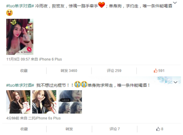 又是一年“雙十一”,單身狗又準(zhǔn)備怎樣玩壞“光棍節(jié)”?性感明星王李丹妮微博求“脫單”:“單身狗,求約走,唯一條件能喝酒”,網(wǎng)友也耐不住寂寞紛紛效仿“脫單體”,約酒求“脫單”。