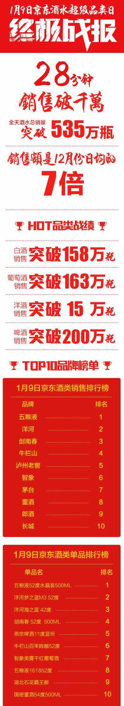 1月9日,京東超市“酒水超級品類日”主題大促再傳捷報,截止24點,全天酒水總銷量突破535萬瓶,重量達(dá)2480噸,超過2個長征5號火箭的總重量。活動開啟28分鐘,酒水銷售額破千萬,超2016年12月日均銷售額的7倍。