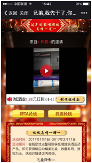 最近小編發(fā)現(xiàn)了一個(gè)比較特別的活動(dòng),這個(gè)名為“新年一起喝一杯”的線上營(yíng)銷活動(dòng),通過(guò)在活動(dòng)頁(yè)面?zhèn)鞑ヒ皇住缎值芤黄鸷纫槐返囊魳?lè)mv,用戶看到這種情懷滿滿的mv,也可以根據(jù)自己本地的圖片和視頻在微信即可一鍵制作一條邀請(qǐng)好友喝一杯的小短片,在轉(zhuǎn)發(fā)到朋友圈或者微信好友分享,也不需要下載app,小短片就能轉(zhuǎn)發(fā)分享了,這樣的形式很利于推廣,也很有趣!