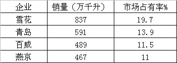 從表中可見,雪花的銷量和市場占有率已遠遠高于青島,緊隨其后的百威,燕京和其差距不大,如果雪花的收購繼續,那么銷量優勢會持續擴大。