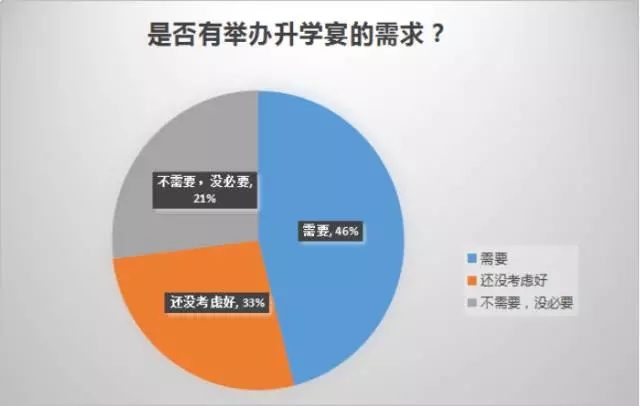 夏季本是白酒市場的消費淡季,卻因升學宴用酒的升溫,給有些疲軟的市場注入了一針強心劑。為此,酒說記者針對“孩子高考后,家長是否有舉辦升學宴的需求?”專門做了抽樣調查,分析了110名考生家長的數據。數據顯示,46%的考生家長有舉辦升學宴慶祝的需求,僅有21的%的家長明確表示自己沒有這方面需求。