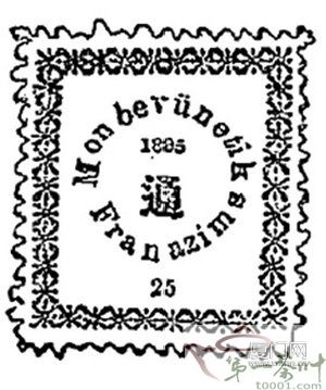 貨幣的最初樣本是附在一封寄給美國沃拉普克語專家查理斯的信件當中。查理斯1888年著有《沃拉普克語手冊》一書,還曾擔任過美國國際工會儲蓄銀行駐廈執行總裁。他所收到的這份樣本比較粗糙,以郵票的樣式,用紅墨汁印制在薄白紙上,邊緣為鋸齒狀(如圖所示,在此暫稱其為“通”字票)。“通”字票的票中上方寫有“Mon bevünetik”,其意思是“money between nation”,即“國際間貨幣”。 中間為中文的“通”字,為通行、流通之意,“1895”則是此票發行年。下方“Franazim”代表法郎貨幣,下方數字為“25”,表示25生丁,即四分之一法郎。