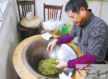 “采摘下的茶葉要陰干兩個小時左右,然后篩選,將老葉、大葉、茶梗挑出;接著開始第一道‘青鍋’,然后是‘輝鍋’,其中攤放是前提,青鍋是基礎,輝鍋是關鍵。”作為“茶二代”小徐對整個炒茶工藝了如指掌。