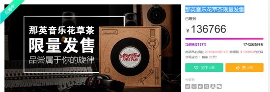 日前,一款“那英音樂花草茶”出現在京東眾籌平臺,上線5小時即完成全部眾籌金額10萬元。截至今日,已獲得1742名支持者,籌到136766元。