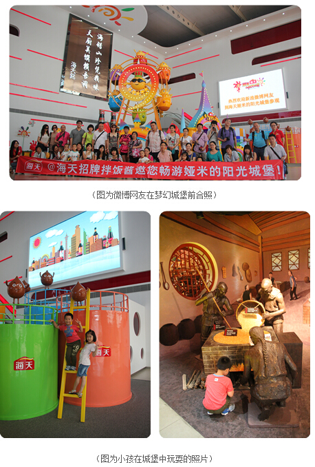 在新浪微博@海天招牌拌飯醬的組織下,第一批新浪微博網(wǎng)友在5月25日走進(jìn)了海天(高明)工業(yè)園。來自廣佛兩地的36名新浪微博網(wǎng)友及家屬暢游了婭米的陽光城堡,度過了一個(gè)歡樂的周末!