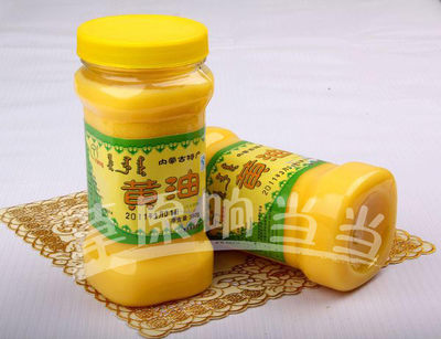 黃油營養極為豐富,是奶食品之冠,因為五、六十斤酸奶才可提取二斤左右的黃油,足見其珍貴。為食用方便,牧民常把黃油裝在器皿或牛羊胃囊內。黃油具有增添熱力、延年益壽之功能。寒冬季節人畜受寒凍僵時,常用罐飲黃油茶、黃油酒來解救。時至八月,人們把黃油裝進羊小肚子將其保存起來,待食用時開啟,由于不與空氣接觸,所以一塵不染,依然是新鮮滋潤、綿甜可口。