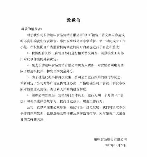 12月22日消息,絕味食品發布公告稱,因違反廣告法相關規定,公司被罰款60萬元。原因是絕味鴨脖在雙十一前夕在其天貓旗艦店上推出的一張海報引起的,網友舉報后該海報被撤下,但時隔一日,絕味鴨脖官方微信再次推送低俗的廣告文章。