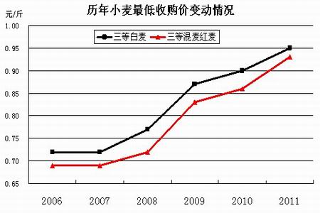 10月12日,據國家發改委網站信息,為保護農民種糧積極性,進一步促進糧食生產發展,經國務院批準,決定從明年新糧上市起適當提高主產區2011年生產的小麥最低收購價水平。白小麥及混麥、紅麥(三等,每斤)價格分別從0.9元和0.86元提高到0.95元和0.93元,分別提高0.05元和0.07元,品種價差從過去的0.04元縮小到0.02元,等級價差不變。